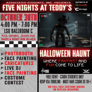 ASI is inviting you to Halloween Haunt: Five Nights at Teddy’s! Join ASI for a frightful night of activities, food, and scares on October 30, from 4 – 7 P.M., in LSU, Ballroom C.